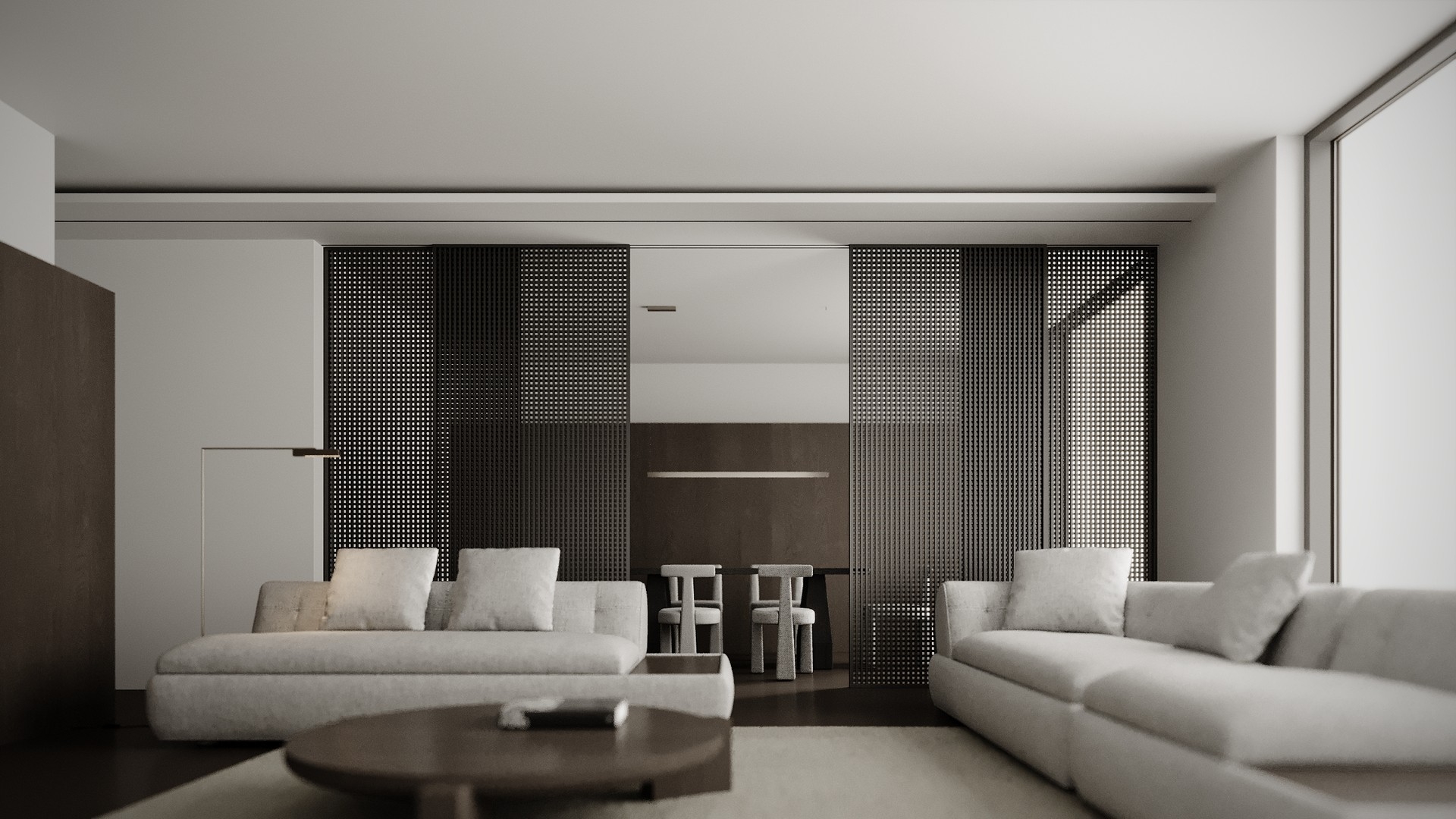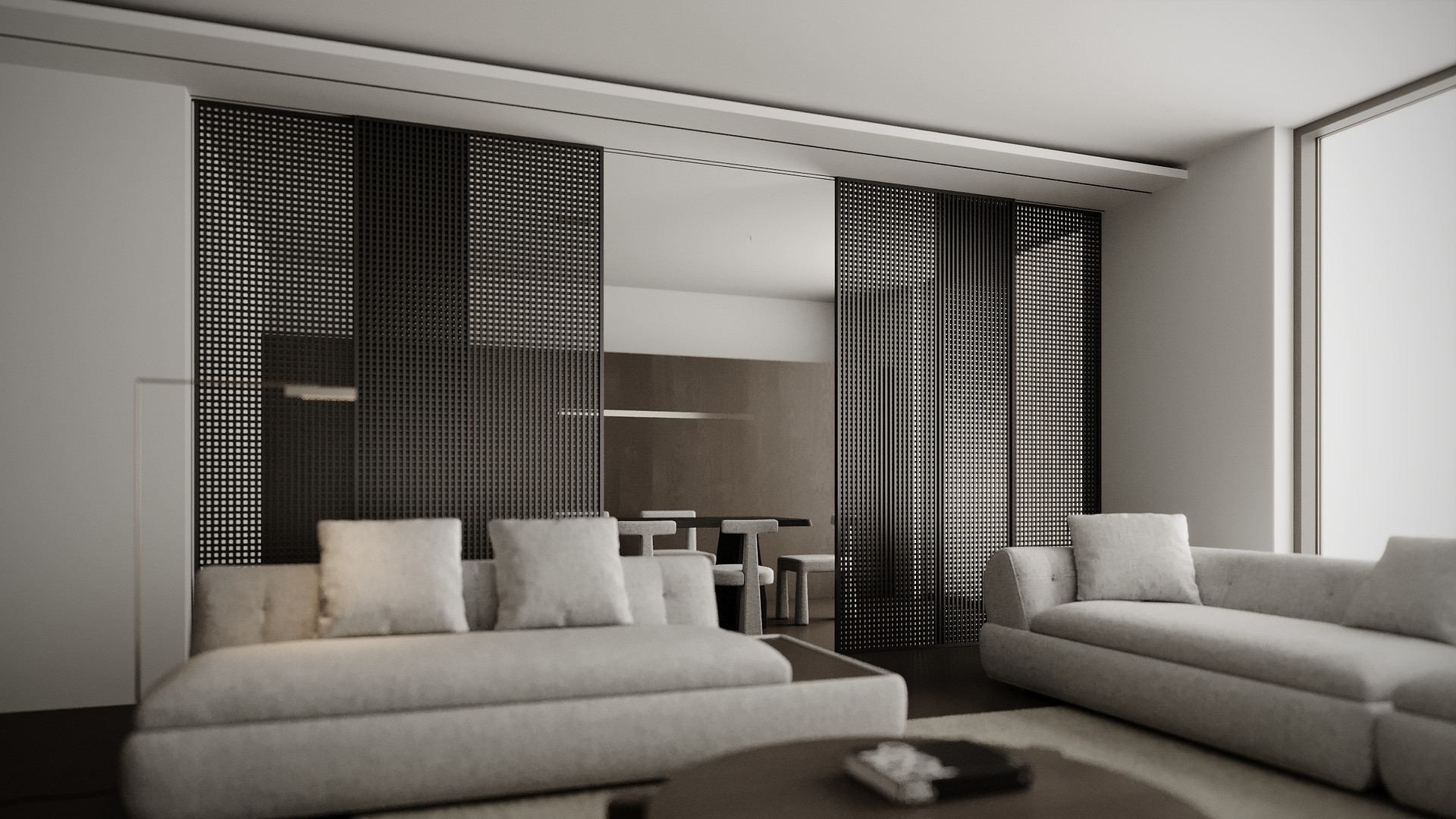 Это конструкция для зонирования пространства, состоящая из параллельно расположенных вертикальных и горизонтальных реек, закреплённых на каркасе или без него.